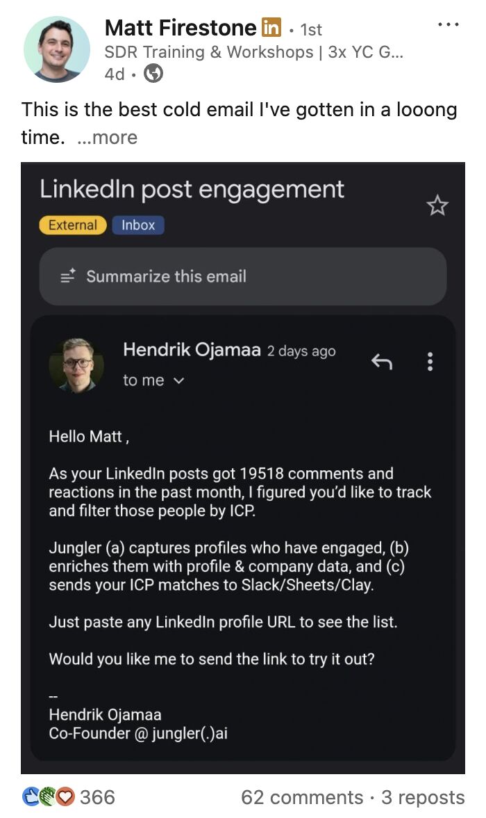 One recipient summed it up perfectly after receiving a Jungler email sent via Salesforge:
